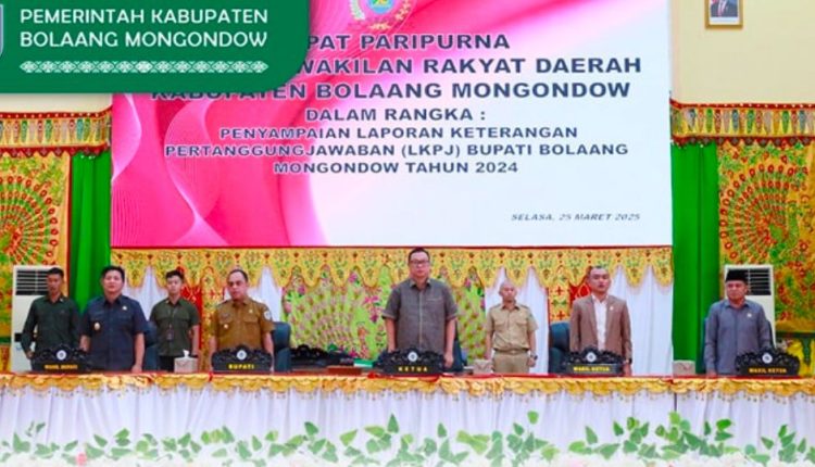 BOLMONG- Dewan Perwakilan Rakyat Daerah (DPRD) Kabupaten Bolaang Mongondow (Bolmong) menggelar paripurna penyampaian Laporan Keterangan Pertanggungjawaban (LKPJ) Tahun Anggaran 2024, di Lolak, Selasa 25 Maret 2025.