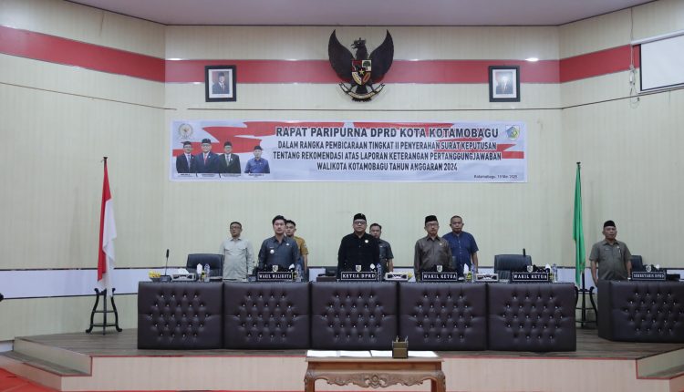 Turut Hadir: Rapat Paripurna DPRD Kota Kotamobagu dalam rangka Pembicaraan Tingkat II Penyerahan Surat Keputusan Tentang Rekomendasi atas LKPJ WaliKota Kotamobagu Tahun Anggaran 2024, yang dipimpin Ketua DPRD Kota Kotamobagu, Adrianus Mokoginta., S.E tersebut, juga dihadiri Wakil Ketua DPRD Kota Kotamobagu, Ahmad Sabir., S.E., para Anggota DPRD Kota Kotamobagu, Perwakilan Forkopimda Kota Kotamobagu, Sekretaris Daerah Kota Kotamobagu, Sofyan Mokoginta., S.H., ME., para Asisten, para Pimpinan Perangkat Daerah serta ASN dilingkungan Pemerintah Kota Kotamobagu.