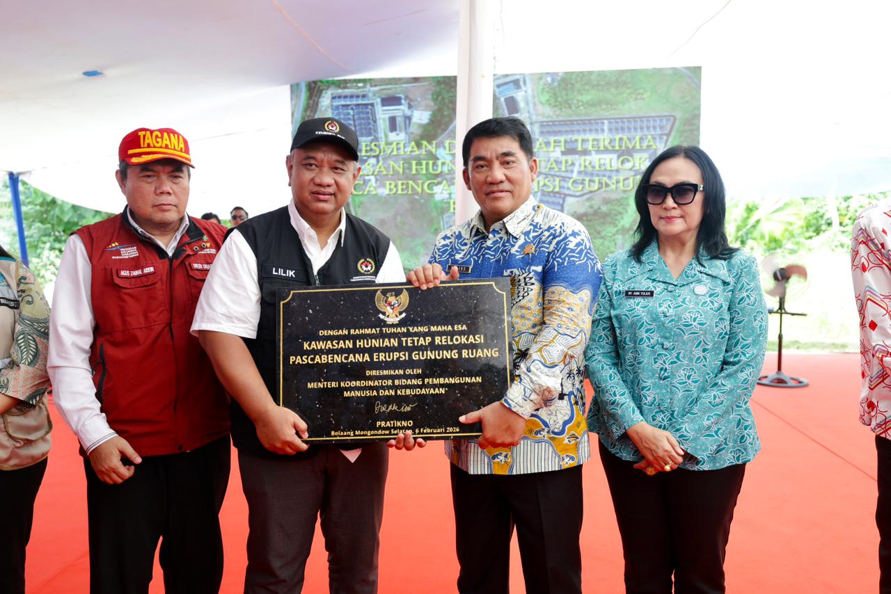 BOLSEL- Gubernur Sulawesi Utara, Mayjen TNI (Purn) Yulius Selvanus, SE secara resmi menyerahkan kunci rumah hunian tetap (huntap) kepada warga pengungsi terdampak erupsi Gunung Ruang, bertempat di Kabupaten Bolaang Mongondow Selatan (Bolsel), Jumat (13/2/2026).
