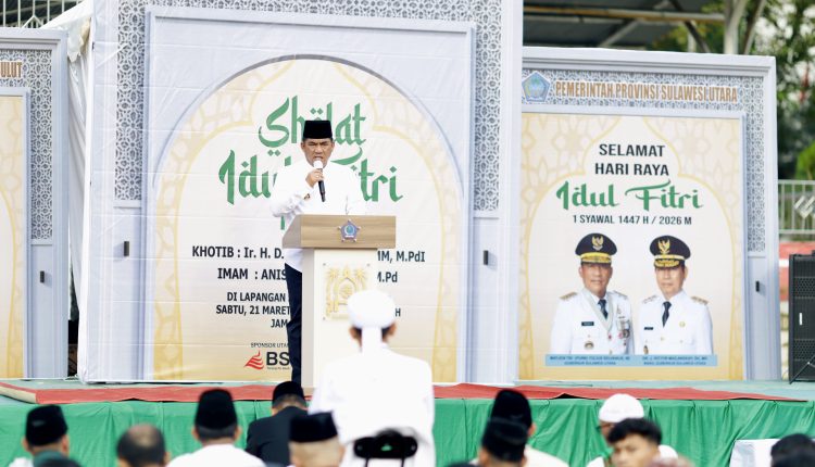 SULUT – Gubernur Sulawesi Utara, Mayjen TNI (Purn) Yulius Selvanus, SE menghadiri pelaksanaan Sholat Idul Fitri 1447 Hijriah di Lapangan Sparta Tikala, Manado, Sabtu (21/3/2026) pagi.